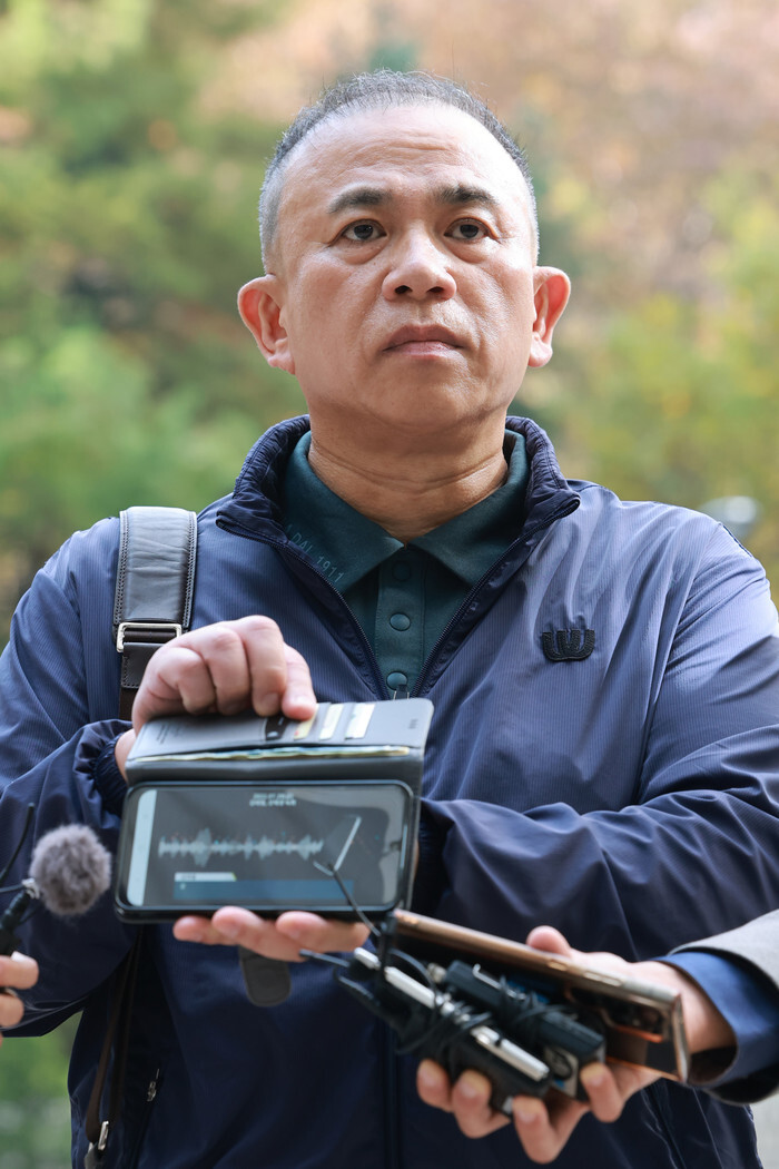 Self-proclaimed power broker Myung Tae-kyun meets the press as he appears at the Seoul Central District Court in the capital city on Nov. 7, 2025, to attend a hearing as a witness over an election meddling scandal surrounding Kim Keon Hee, wife of former President Yoon Suk Yeol. (Yonhap)
