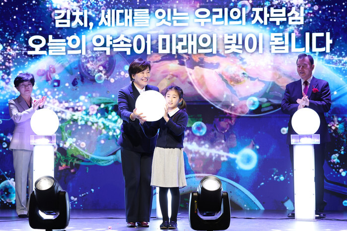 Agriculture, Food and Rural Affairs Minister Song Mi-ryung (2nd from L) takes part in a ceremony at the National Folk Museum in Seoul on Nov. 21, 2025, to mark Kimchi Day a day ahead. The government has designated Nov. 22 as Kimchi Day to promote the kimchi industry and raise public awareness of the Korean traditional side dish's nutritional value. (Yonhap)