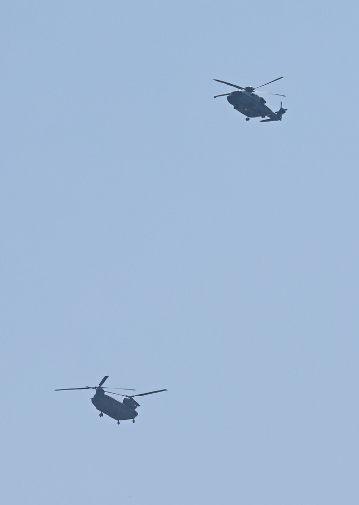 Marine One (top), carrying U.S. President Donald Trump, with a Chinook helicopter below, flies over Gyeongju, North Gyeongsang Province, southeastern South Korea, on Oct. 29, 2025, as he travels to the Gyeongju Arts Center to take part in the CEO Summit of the Asia-Pacific Economic Cooperation forum. (Yonhap)