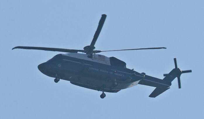 Marine One, carrying U.S. President Donald Trump, flies over Gyeongju, North Gyeongsang Province, southeastern South Korea, on Oct. 29, 2025, as he travels to the Gyeongju Arts Center to take part in the CEO Summit of the Asia-Pacific Economic Cooperation forum. (Yonhap)