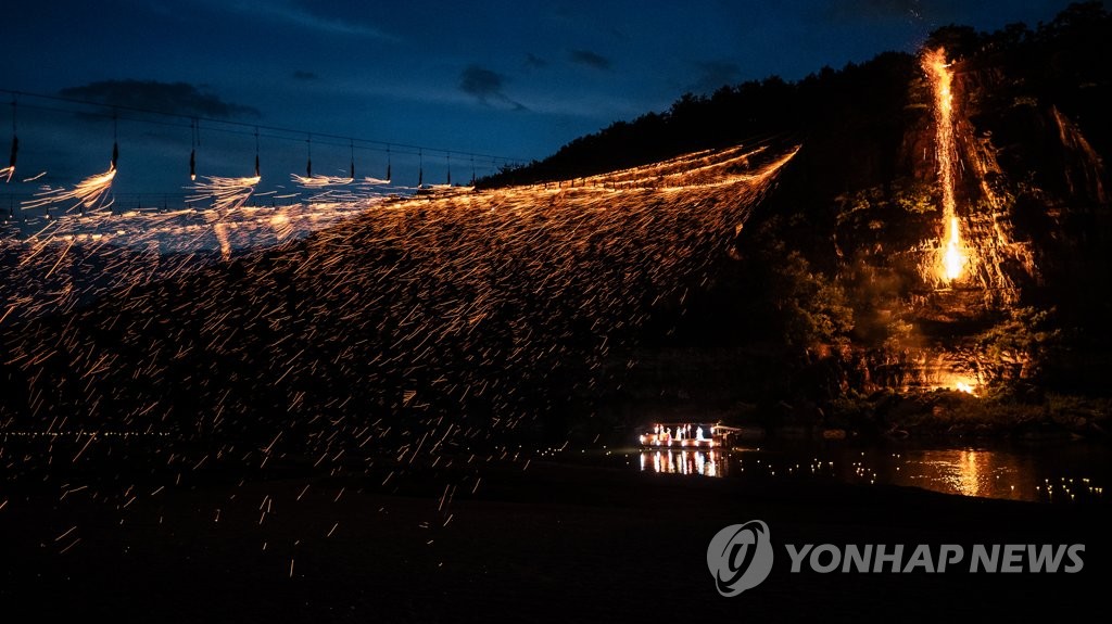 | ▲ 안동 하회마을 수놓는 불꽃 (안동=연합뉴스) 윤관식 기자 = 24일 오후 경북 안동 하회마을 만송정 일원에서 '하회 선유줄불놀이'가 열리고 있다. 2023.6.24 psik@yna.co.kr |