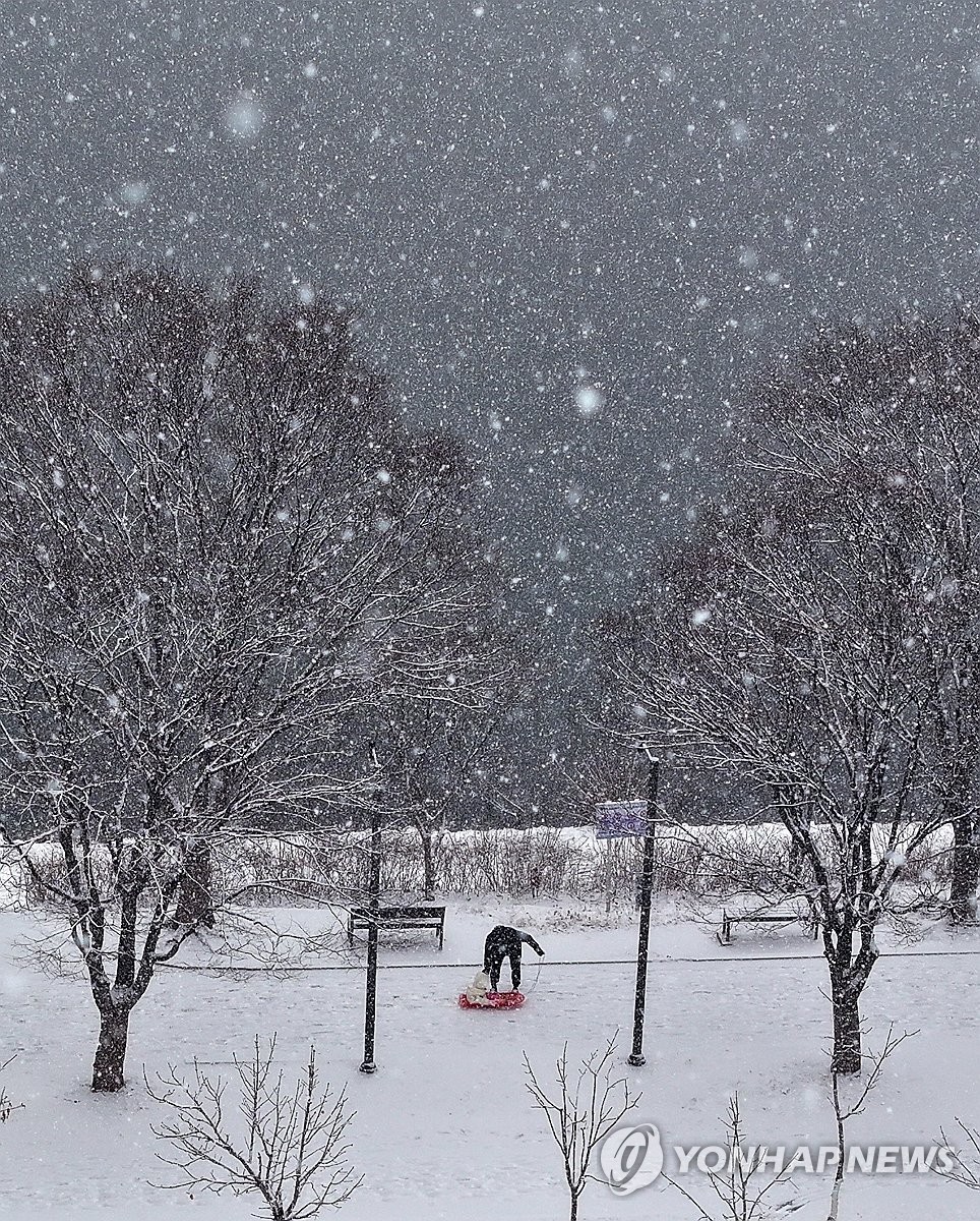 | ▲ 아빠와 만드는 겨울 추억 (춘천=연합뉴스) 양지웅 기자 = 전국 곳곳에 눈이 내리는 25일 강원 춘천시 공지천 산책로에서 한 시민이 함박눈을 맞으며 자녀에게 썰매를 태워주고 있다. 2023.12.25 yangdoo@yna.co.kr |