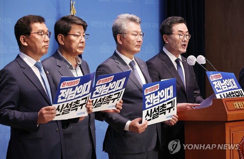 | ▲ Lawmakers from the main opposition Democratic Party representing the South Jeolla region, 290 kilometers south of Seoul, hold a press conference calling for the establishment of new medical schools in their region at the National Assembly in Seoul on Oct. 17, 2023. (Yonhap) |