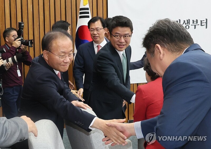 | ▲ Rep. Yun Jae-ok (L) of the ruling People Power Party shakes hands with another party member before a party meeting at the National Assembly in Seoul on Oct. 17, 2023. (Yonhap) |