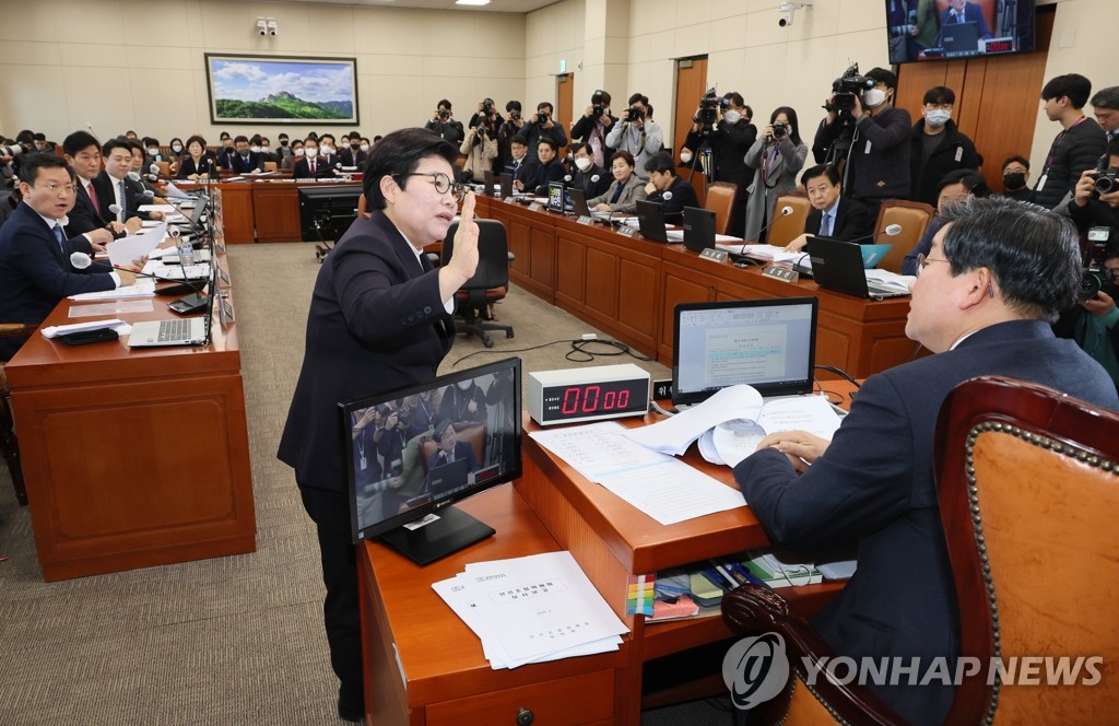 | ▲ Rep. Lim Lee-ja (L) of the ruling People Power Party speaks to Rep. Jeon Hae-chel of the main opposition Democratic Party, who heads the parliamentary labor and environment committee, at a committee plenary meeting at the National Assembly on Feb. 21, 2023. (Yonhap) |