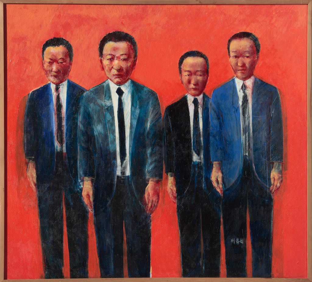 1984, 1986년 그린 '정치인'은 이번 전시에서 소개되는 그림 중 초기 작업에 해당한다. 양복을 입은 4명의 남성을 그린 이 그림은 1980년대 군사정부에서 '군인'에서 '정치인'으로 변신했던 인물들을 담은 것이다.