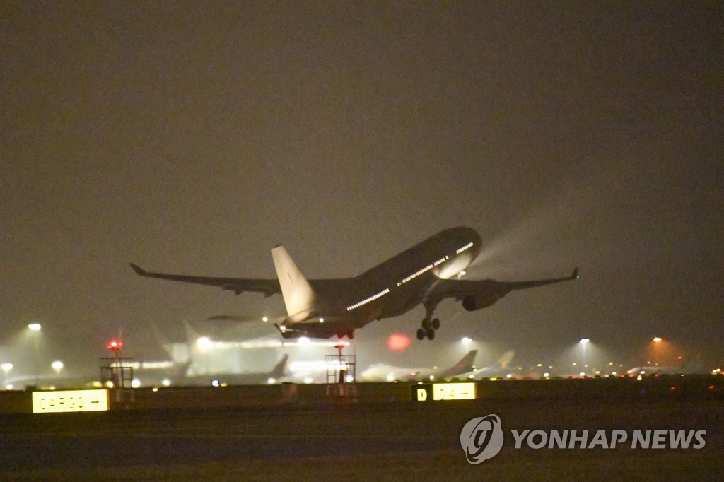 | ▲ A KC-330 military tanker aircraft carrying 118 rescue workers and relief supplies takes off at Incheon International Airport, west of Seoul, on the night of Feb. 7, 2023, to head for quake-devastated Turkey, in this photo provided by the Air Force. (PHOTO NOT FOR SALE) (Yonhap) |