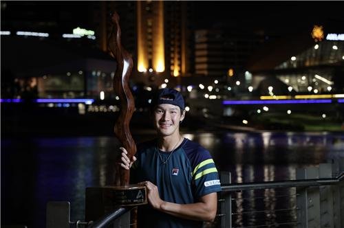 | ▲ 권순우, 한국 선수 최초 남자프로테니스 투어 2회 우승 (서울=연합뉴스) 권순우가 14일(현지시간) 호주 애들레이드에서 열린 ATP 투어 애들레이드 인터내셔널 2차 대회 결승에서 로베르토 바우티스타 아굿(스페인)을 2-1(6-4 3-6 7-6<7-4>)로 제압한 뒤 우승 트로피를 들고 기념 촬영하고 있다. 권순우는 2021년 9월 아스타나오픈에 이어 개인 통산 2번째 투어 우승을 달성하며 이형택 오리온 테니스단 감독(우승 1회)을 제치고 한국인 ATP 투어 최다 우승 기록을 보유하게 됐다. 2023.1.14 [호주테니스협회 제공. 재판매 및 DB 금지] photo@yna.co.kr |