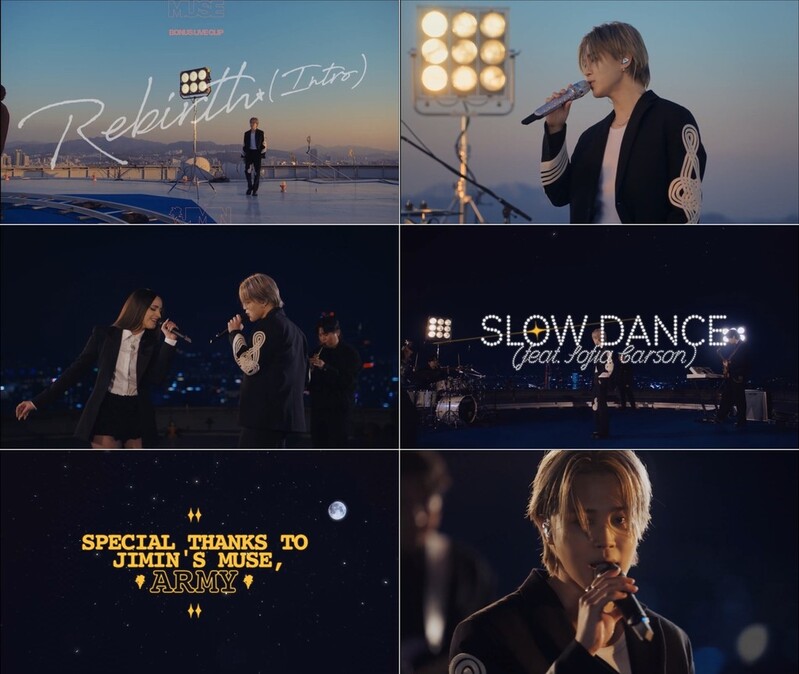 지민은 서울 시내 한 고층 건물 옥상을 배경으로 라이브 밴드와 함께 신보 수록곡 '리버스 (인트로)'(Rebirth (Intro))와 '슬로우 댄스'(Slow Dance)를 불렀다.