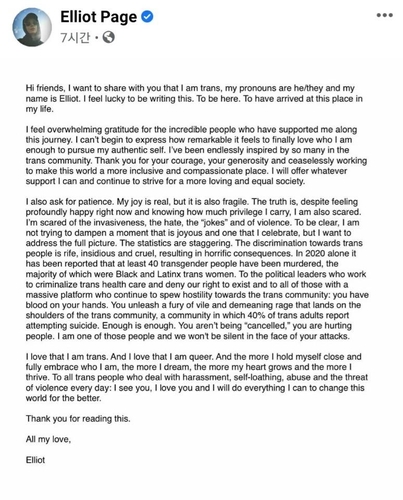 페이지는 "내가 트랜스젠더라는 사실을 여러분과 공유하고 싶다"며 "나를 가리키는 대명사는 '그'(he)이고, 내 이름은 엘리엇"이라고 밝혔다.