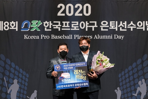 | ▲ 김태균, 은퇴선수가 선정한 특별상 (서울=연합뉴스) 김태균(오른쪽)이 3일 서울 강남구 리베라호텔에서 열린 2020 스팟 한국프로야구 은퇴선수의 날 시상식에서 올해의 최고 선수상을 받은 뒤 시상자 이종범 LG 트윈스 코치와 함께 기념 촬영을 하고 있다. [한국프로야구은퇴선수협회 제공. 재판매 및 DB금지] |