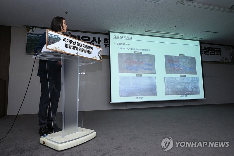정소영 국립고궁박물관 유물과학과장은 "석재 내부로 오염 물질이 스며들 가능성이 커 스프레이 오염 물질을 제거하는 긴급 보존 처리 위주로 작업을 진행했다"고 설명했다.