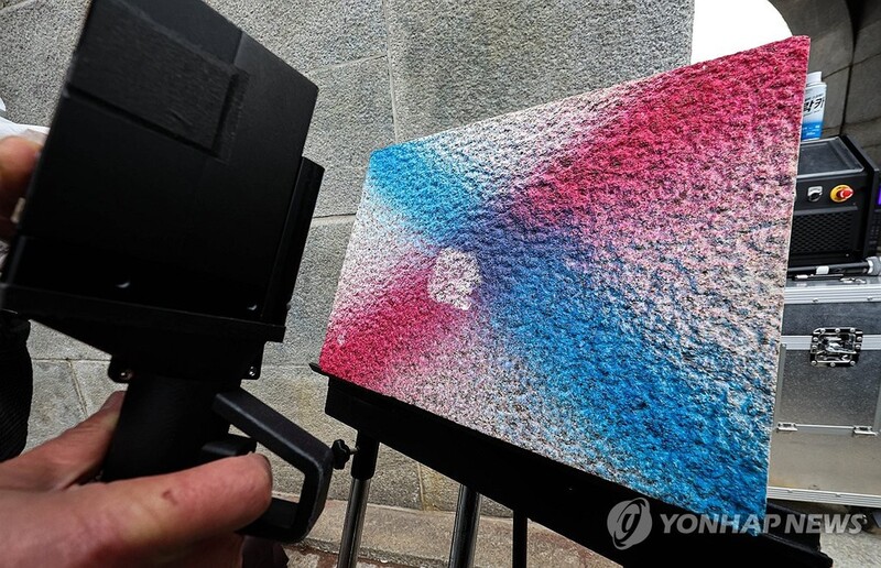 ▲ 레이저 장비 활용한 경복궁 낙서 제거 작업 시연 (서울=연합뉴스) 신현우 기자 = 4일 오전 서울 종로구 경복궁 영추문에서 이태종 국립문화재연구원 학예연구사가 레이저 장비를 활용해 낙서 제거 작업을 시연하고 있다. 이날 문화재청은 낙서 제거 작업을 마친 경복궁 담장을 공개했다. 2024.1.4 [공동취재] nowwego@yna.co.kr