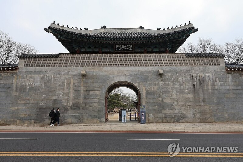 ▲ 낙서 제거 마친 경복궁 영추문 (서울=연합뉴스) 신현우 기자 = 4일 오전 낙서 제거 작업을 마친 서울 종로구 경복궁 영추문 앞을 시민들이 지나가고 있다. 2024.1.4 nowwego@yna.co.kr