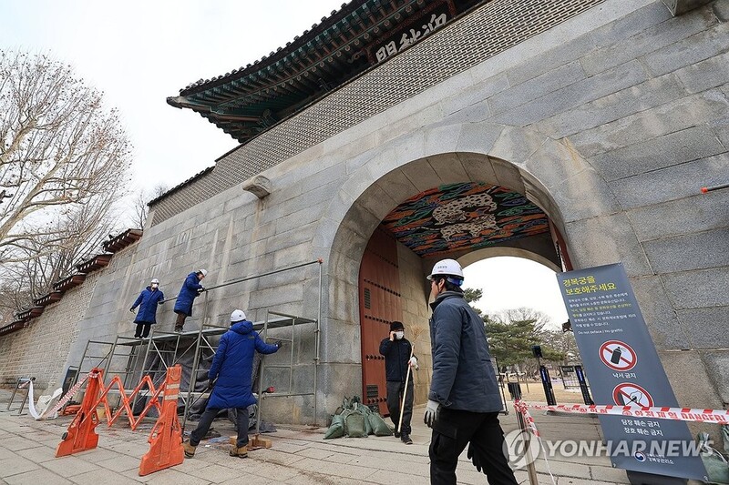 ▲ 경복궁 영추문 가림막 철거 작업 (서울=연합뉴스) 신현우 기자 = 4일 오전 서울 종로구 경복궁 영추문에서 문화재청 관계자들이 가림막을 철거하고 있다. 이날 문화재청은 낙서 제거 작업을 마친 경복궁 담장을 공개한다. 2024.1.4 nowwego@yna.co.kr