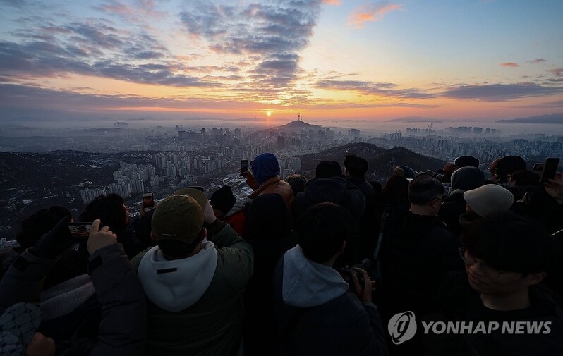 | ▲ '해가 뜬다' (서울=연합뉴스) 류영석 기자 = 2024년 새해를 맞은 1일 오전 서울 서대문구 안산 봉수대에서 해맞이객들이 새해 첫 일출을 보고 있다. 2024.1.1 ondol@yna.co.kr |