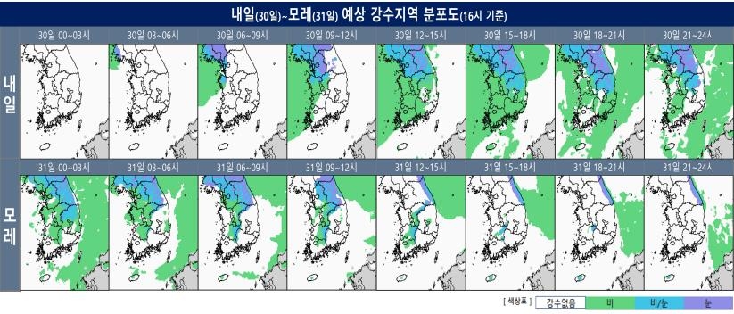충청권과 전라권은 31일 저녁까지, 강원영동과 경북북부동해안, 제주도는 31일 밤까지 눈이나 비가 이어지겠다.