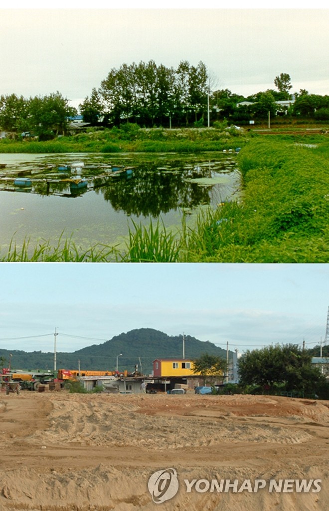 | ▲ 화성 만년제(滿年堤) 복원 추진 (화성=연합뉴스) 경기도 화성시가 복원을 추진중인 도(道)기념물(제161호)로 지정된 화성 만년제(滿年堤.둑). 사진 위쪽은 도 기념물로 지정될 1990년대 중반 전경으로 제 모습을 갖추고 있는 반면 아래쪽 사진은 저수지가 매립돼 형체를 알아볼 수 없을 정도로 만년제가 훼손돼 있다.<<전국부기사 참조, 화성시청 제공>> gaonnuri@yna.co.kr |