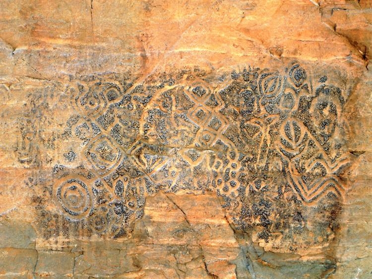 너비 9.5m, 높이 2.7m 크기의 바위 면에는 기하학적 무늬를 비롯해 사슴, 반인반수(半人半獸·머리는 사람, 몸은 동물인 형상), 배, 기마행렬도 등이 새겨져 있다.