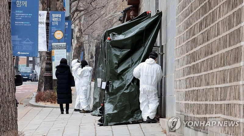 | ▲ 경복궁 담벼락 낙서 제거 (서울=연합뉴스) 김도훈 기자 = 17일 오전 서울 종로구 국립고궁박물관 쪽문 경복궁 담벼락 앞에서 문화재청 관계자들이 전날 누군가가 스프레이로 쓴 낙서 제거 작업을 하고 있다. 2023.12.17 [공동취재] superdoo82@yna.co.kr |
