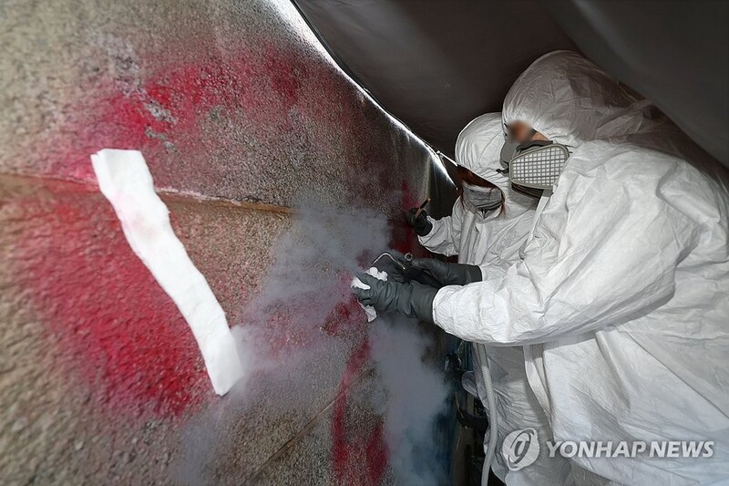 이들은 29일까지 낙서 흔적을 지우고 주변 석재와 색을 맞추는 과정을 진행할 예정이다.
