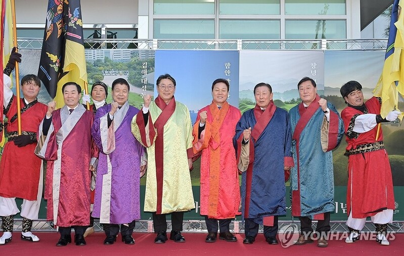 | ▲ 가야고분군 세계유산 등재기념 (창원=연합뉴스) 경남도가 21일 경남권 가야고분군의 유네스코 세계문화유산 등재를 기념하는 '가야의 숨결·역사의 이음 가야고분군 세계유산 등재 기념식'을 함안군 함안체육관에서 개최했다. 왼쪽부터 성낙인 창녕군수, 이상근 고성군수, 홍태용 김해시장, 박완수 경남지사, 조근제 함안군수, 김윤철 합천군수가 가야시대 옷을 입고 기념촬영을 하고 있다. 2023.12.21 [경남도 제공. 재판매 및 DB 금지] seaman@yna.co.kr |