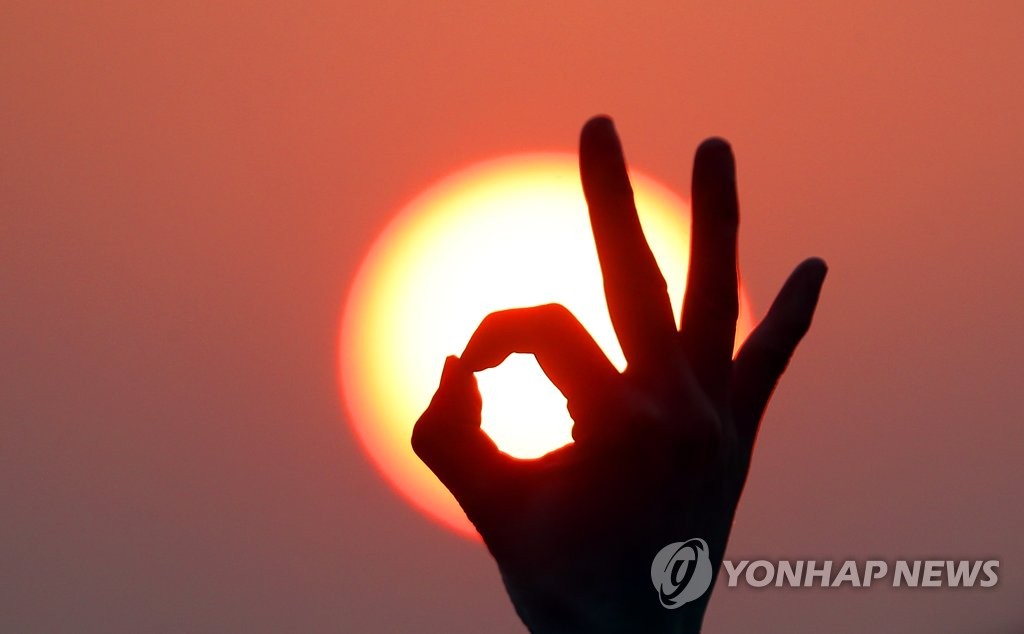 | ▲ '새해야 반가워, 모든 일 OK' (경주=연합뉴스) 2023년 첫날인 1일 오전 경북 경주시 양북면 문무대왕릉 앞 바닷가에서 한 해맞이객이 토끼와 OK를 뜻하는 손 모양을 하며 새해 첫 해돋이를 보고 있다. |