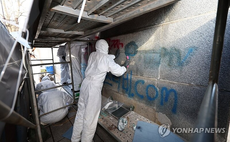 범행 직후인 오전 2시 20분께 신고를 받은 경찰은 인근 폐쇄회로(CC)TV 등을 토대로 낙서를 한 용의자를 추적하고 있다. 문화재보호법 위반과 재물손괴 혐의 등이 적용될 것으로 보인다.