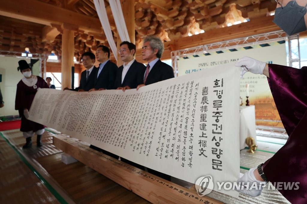 희경루 중건 자문위원장을 맡은 천득염 한국학 호남진흥원장은 건립, 소실, 중건까지 연혁과 광주 공동체의 의, 예, 풍류, 멋이 퍼져나가기를 기원하는 축원을 상량문에 담았다.