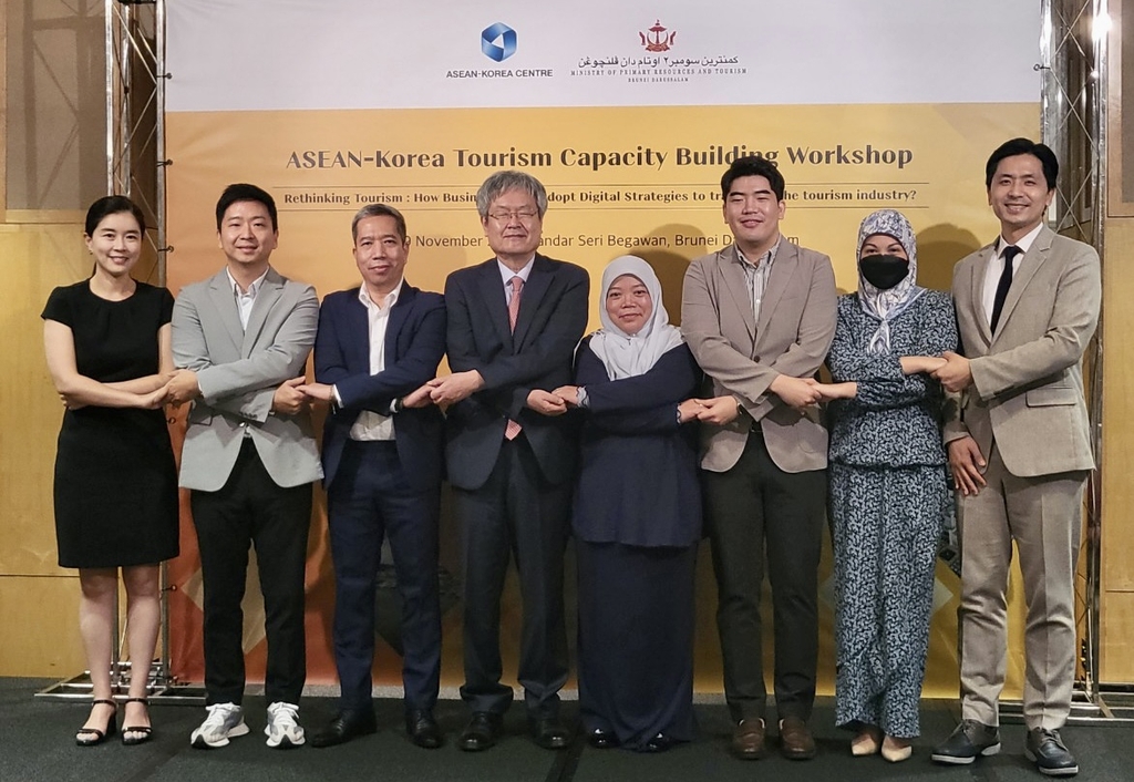 | ▲ '한-아세안 관광 역량 강화 워크숍' 참석자들 왼쪽부터 두 번째 정지하 트립비토즈 대표, 세 번째 알렉스 문화관광국 국장, 네 번째 김해용 한-아세안센터 사무총장, 다섯 번째 하자 달리아나 브루나이 자원관광부 차관, 일곱 번째 살리나 브루나이 관광개발국 국장. [트립비토즈 제공. 재판매 및 DB 금지] |