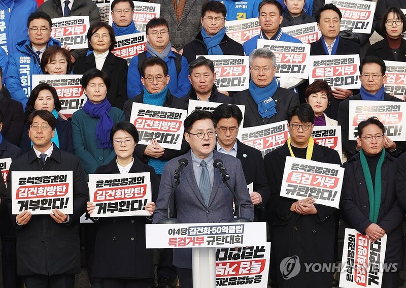 Lawmakers from the DP and other minor opposition parties held a protest rally in front of the main building of the National Assembly after Yoon rejected the bills.