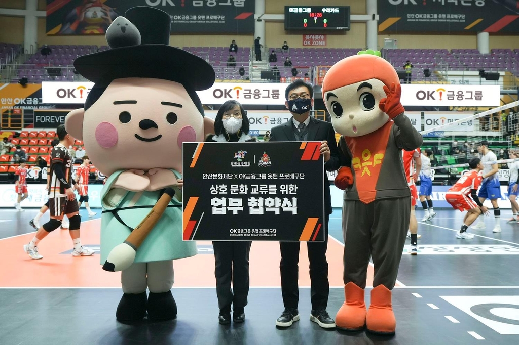 (안산=연합뉴스) 김인유 기자 = 안산문화재단은 안산시를 연고지로 둔 프로배구남자부 OK금융그룹 배구단과 홍보 협약을 체결했다고 22일 밝혔다.