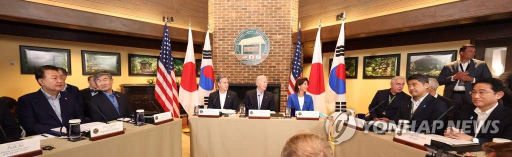 CAMP DAVID, Maryland, Aug. 18 (Yonhap) -- South Korean President Yoon Suk Yeol, U.S. President Joe Biden and Japanese Prime Minister Fumio Kishida agreed Friday to consult with one another in the event of a common threat, elevating their trilateral partnership to a new level amid security and economic challenges posed by North Korea and China.