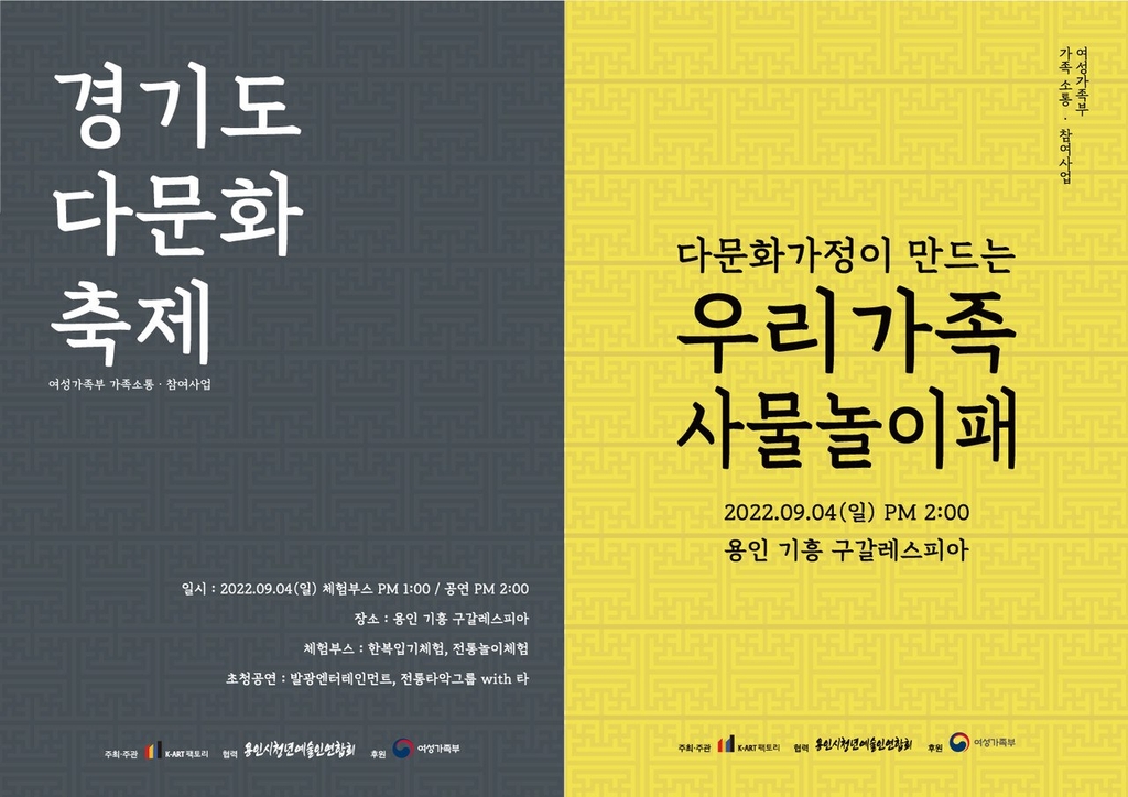 (서울=연합뉴스) 이상서 기자 = 이주민과 선주민 간 화합을 돕고 다문화가족에게 우리 전통문화 체험 기회를 제공하는 '우리가족 사물놀이패 발표회' 축제가 내달 4일 용인 기흥 레스피아 야외공연장에서 열린다.