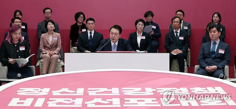 | ▲ In this file photo, President Yoon Suk Yeol (C) speaks at a conference held to announce mental health policies at the former presidential office, Cheong Wa Dae, in Seoul, on Dec. 5, 2023. (Yonhap) |