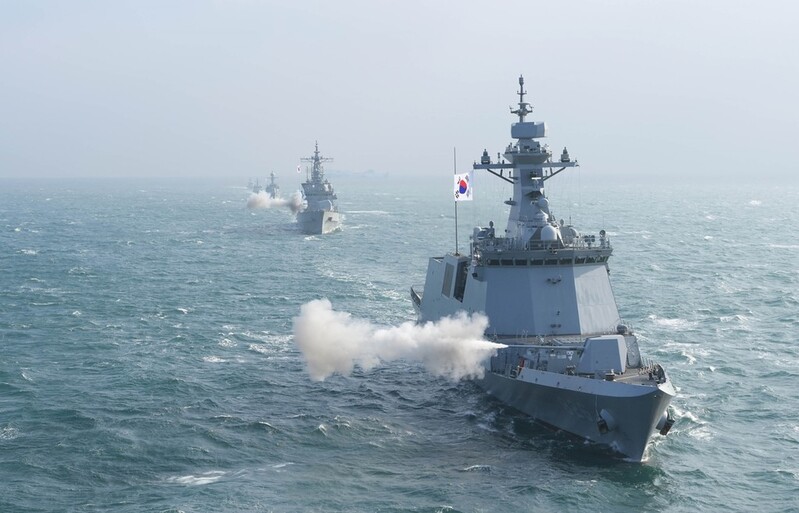 The Second Fleet mobilized five warships, including the flagship 3,200-ton Eulji Mundeok destroyer and the 2,800-ton Cheonan frigate, and an aircraft for live-fire and anti-submarine warfare training in the Yellow Sea.