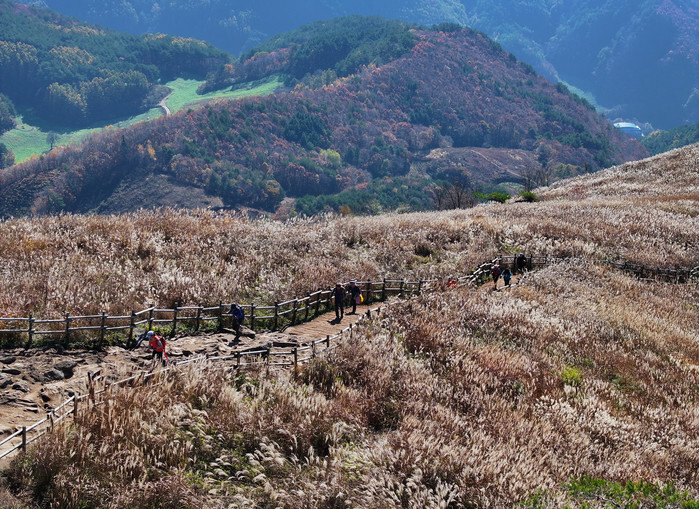 Visitors walk along a pathway through a field of silver grass on Mount Mindung in Jeongseon, Gangwon Province, on Nov. 3, 2024. (Yonhap)