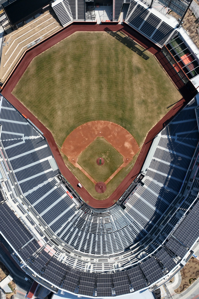 This photo, taken March 17, 2025, shows the Hanwha Eagles' new home stadium, Hanwha Life Ballpark, in the central city of Daejeon. The new stadium, built with two basement floors, four ground floors and 20,007 seats, boasts an asymmetric left and right field, an 8-meter-high monster wall and a double-decker bullpen. (Yonhap)