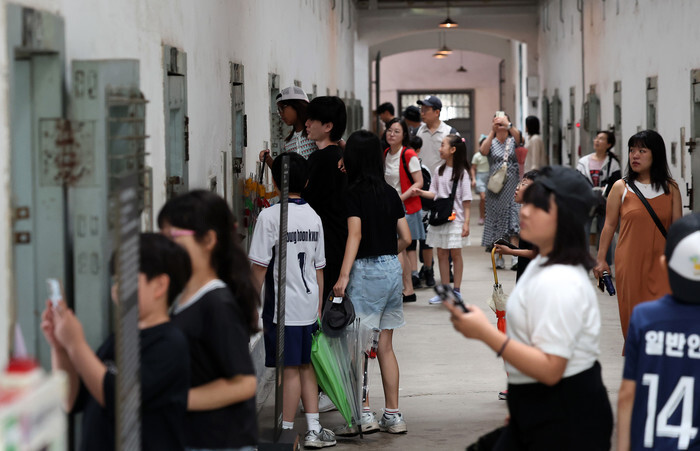 People tour cells at the Seodaemun Prison History Hall in Seoul on Aug. 14, 2025, the eve of the 80th anniversary of Korea's liberation from Japan's 1910-45 colonial rule of the Korean Peninsula. The museum was a former facility where leaders of anti-Japan resistance movements, including independence fighter Yu Gwan-sun, were imprisoned during the 1910-45 colonial period. (Yonhap)