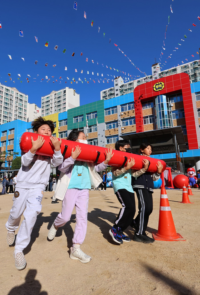 Pupils take part in an athletic meet for the fall season at an elementary school in Incheon, west of Seoul, on Oct. 28, 2025. (Yonhap)