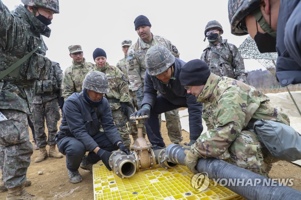 | ▲ South Korean and U.S. logistics troops connect a pipe to install a fuel tank in the border county of Cheorwon, 71 kilometers northeast of Seoul, as part of five-day combined logistics support drills that began March 13, in this photo provided by the South's Army on March 17, 2023. (PHOTO NOT FOR SALE) (Yonhap) |
