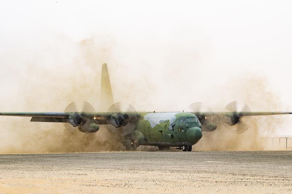 | ▲ A South Korean C-130 transport aircraft taxis on an unpaved runway during the multinational Desert Flag exercise held in the United Arab Emirates from Feb. 26 to March 17, 2023, in this photo provided by the Air Force on March 17. (PHOTO NOT FOR SALE) (Yonhap) |