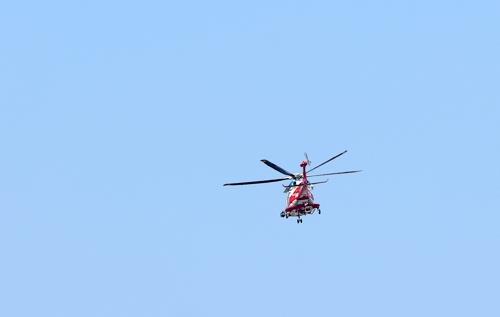 | ▲ A helicopter carrying opposition leader Lee Jae-myung leaves a hospital in Busan for a hospital in Seoul on Jan. 2, 2024, for surgery. (Yonhap) |