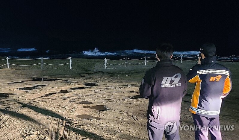| ▲ Firefighters in Gangneung, Gangwon Province, inspect a beach by the East Sea on Jan. 1, 2024, as a major earthquake off Japan's west coast caused minor tsunamis in waters off the South Korean east coast. (Yonhap) |