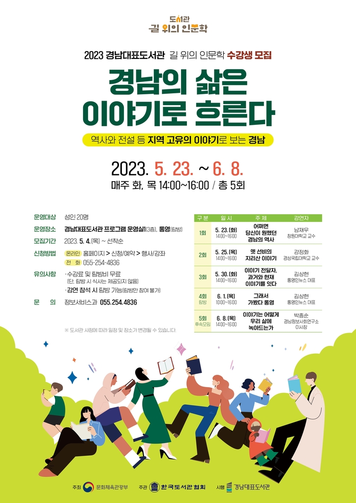 전문가와 함께 '어쩌면 당신이 원했던 경남의 역사', '옛 선비의 지리산 이야기', '이야기 전달자, 과거와 현재 이야기를 잇다', '그래서 가봤다 통영', '이야기는 어떻게 우리 삶에 녹아드는가' 등의 주제로 우리 지역 이야기를 통해 경남을 알아가는 일정을 마련한다.