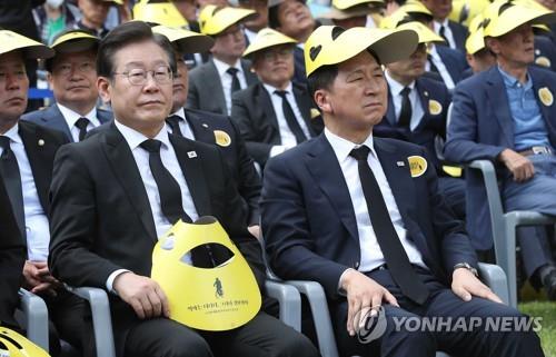 | ▲ Rep. Kim Gi-hyeon (R), the leader of the ruling People Power Party, and Rep. Lee Jae-myung, the leader of the main opposition Democratic Party, are seated for a memorial service for late former President Roh Moo-hyun on May 23, 2023. (Yonhap) |