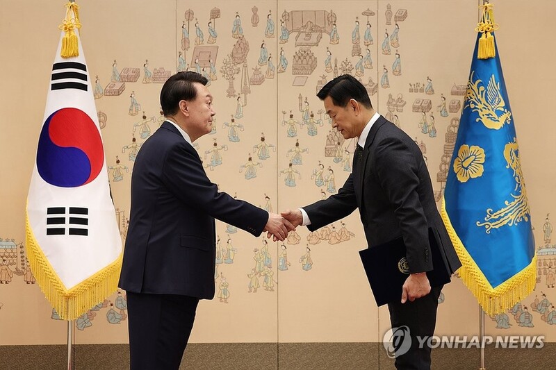 | ▲ President Yoon Suk Yeol shakes hands with new Ambassador to Saudi Arabia Choi Byung-hyuk after presenting him with credentials for the head of the South Korean mission to the Middle Eastern nation during a ceremony at the presidential office in Yongsan on Dec. 28, 2023. (Yonhap) |