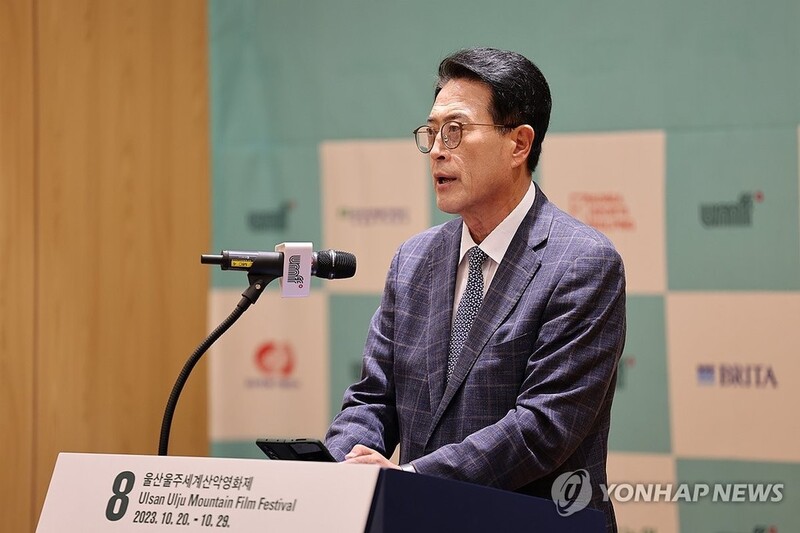 ▲ 인사말 하는 이순걸 울주군수 (울산=연합뉴스) 장지현 기자 = 25일 오전 울산시청 시민홀에서 열린 제8회 울산울주세계산악영화제 기자회견에서 영화제 이사장인 이순걸 울주군수가 인사말하고 있다. 2023.9.25 jjang23@yna.co.kr
