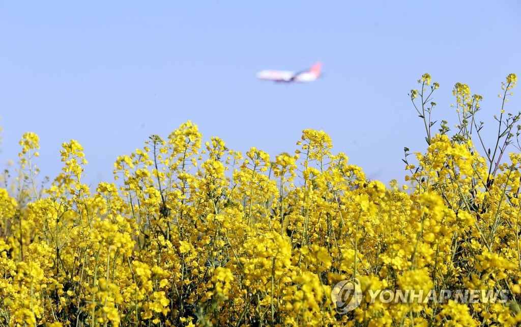 | ▲ 봄 찾아 제주로 (제주=연합뉴스) 변지철 기자 = 화창한 봄기운이 완연한 12일 오전 제주시 용담동 해안가 주변 유채꽃밭 위로 제주행 비행기가 들어오고 있다. 2022.3.12 bjc@yna.co.kr |