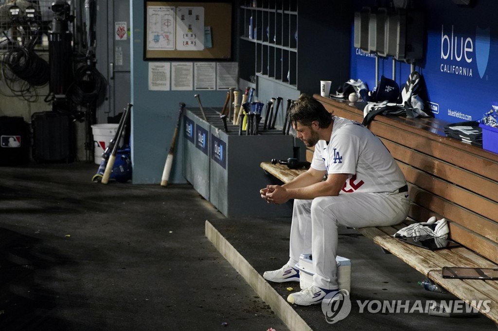 | ▲ 마운드에서 내려와 더그아웃에서 무언가를 생각하는 커쇼 [EPA=연합뉴스 자료사진] |